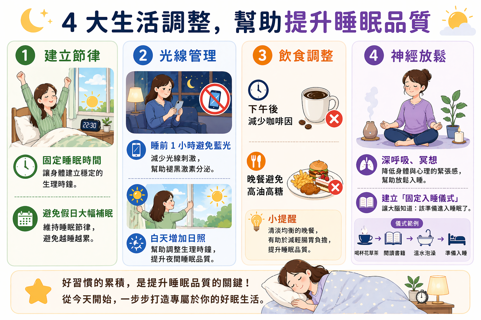 透過生活節律+飲食營養調整,可從不同機制協同支持睡眠相關生理功能,幫助身體回到更穩定的狀態。